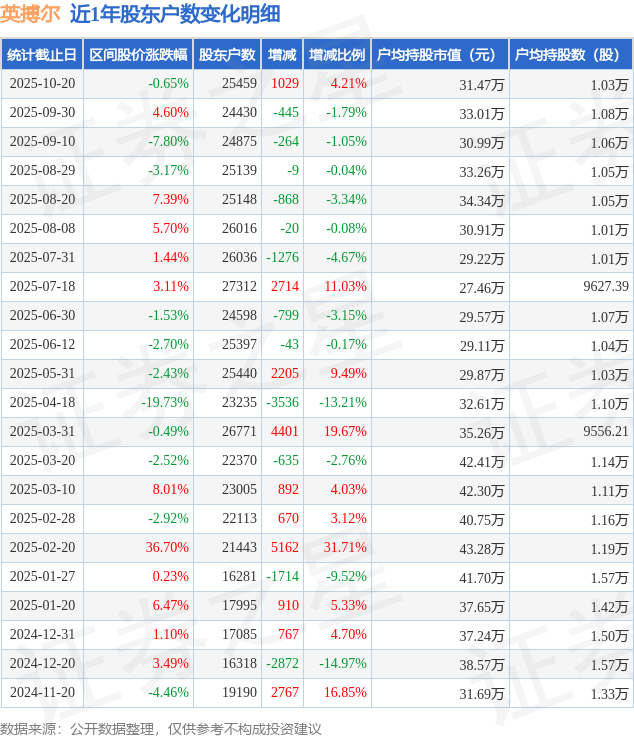 证券之星消息,近日英搏尔披露,截至2025年10月20日公司股东户数为2.55万户,较9月30日增加1029.0户,增幅为4.21%。户均持股数量由上期的1.08万股减少至1.03万股,户均持股市值为31.47万元。