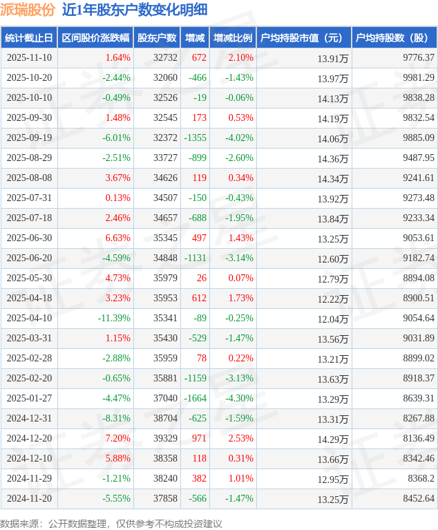 从股价来看,2025年10月20日至2025年11月10日,派瑞股份区间涨幅为1.64%,在此期间股东户数增加672.0户,增幅为2.1%。