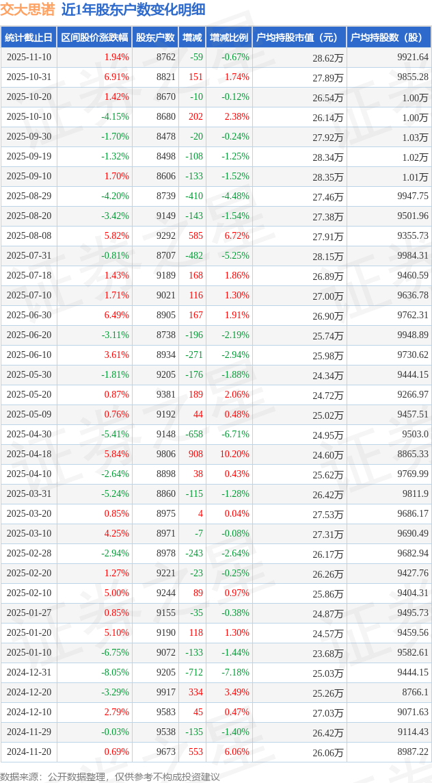 从股价来看,2025年10月31日至2025年11月10日,交大思诺区间涨幅为1.94%,在此期间股东户数减少59.0户,减幅为0.67%。