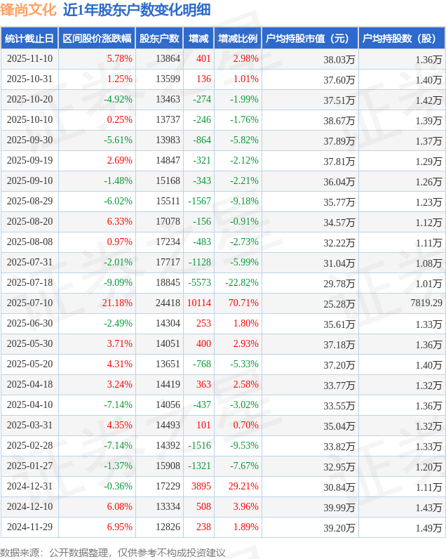 从股价来看,2025年10月20日至2025年11月10日,锋尚文化区间涨幅为5.78%,在此期间股东户数增加401.0户,增幅为2.98%。