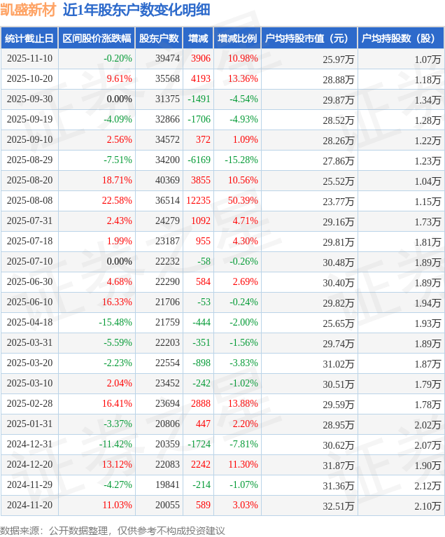 证券之星消息,近日凯盛新材披露,截至2025年11月10日公司股东户数为3.95万户,较10月20日增加3906.0户,增幅为10.98%。户均持股数量由上期的1.18万股减少至1.07万股,户均持股市值为25.97万元。