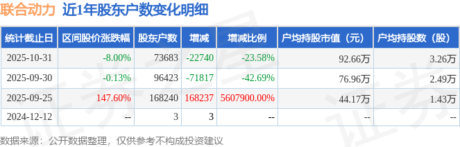 从股价来看,2025年9月30日至2025年10月31日,联合动力区间跌幅为8.0%,在此期间股东户数减少2.27万户,减幅为23.58%。