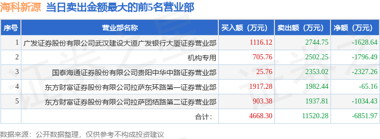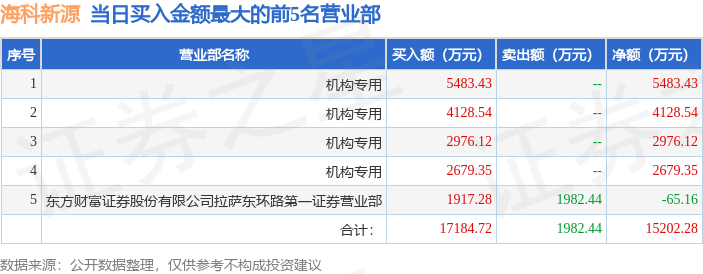 证券之星消息,沪深交易所2025年11月13日公布的交易公开信息显示,海科新源(301292)因日涨幅达到15%的前5只证券登上龙虎榜。此次是近5个交易日内第5次上榜。