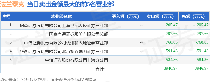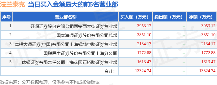 证券之星消息,沪深交易所2025年11月13日公布的交易公开信息显示,法兰泰克(603966)因有价格涨跌幅限制的日收盘价格涨幅偏离值达到7%的前五只证券登上龙虎榜。此次是近5个交易日内第1次上榜。
