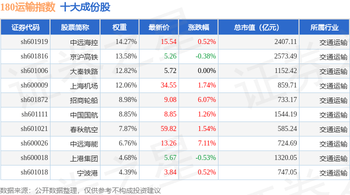 证券之星消息,11月13日,180运输(000027)指数报收于802.68点,涨1.33%,成交72.21亿元,换手率0.45%。当日该指数成份股中,上涨的有7家,中远海能以7.11%的涨幅领涨,下跌的有5家,山东高速以1.99%的跌幅领跌。