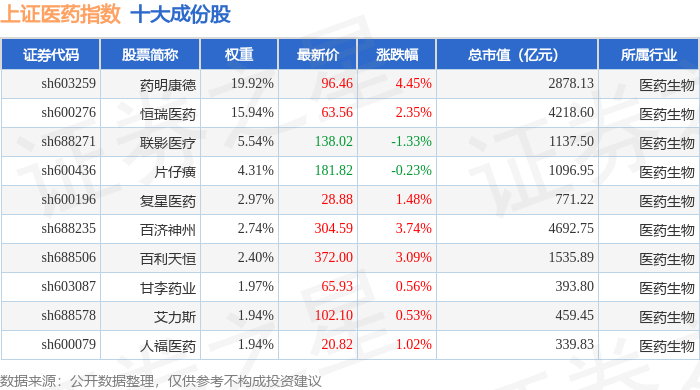 证券之星消息,11月13日,上证医药(000037)指数报收于6857.46点,涨1.63%,成交246.59亿元,换手率1.04%。当日该指数成份股中,上涨的有31家,三生国健以6.57%的涨幅领涨,下跌的有17家,大参林以2.89%的跌幅领跌。