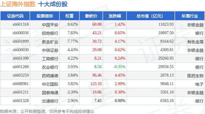 证券之星消息,11月13日,上证海外(000054)指数报收于1606.87点,涨1.1%,成交1046.22亿元,换手率0.36%。当日该指数成份股中,上涨的有42家,东方电气以7.16%的涨幅领涨,下跌的有19家,中国海油以2.1%的跌幅领跌。