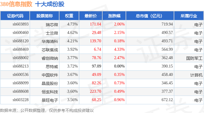 证券之星消息,11月13日,380信息(000111)指数报收于9479.23点,涨1.27%,成交221.88亿元,换手率1.99%。当日该指数成份股中,上涨的有35家,聚辰股份以6.19%的涨幅领涨,下跌的有10家,莱斯信息以2.47%的跌幅领跌。