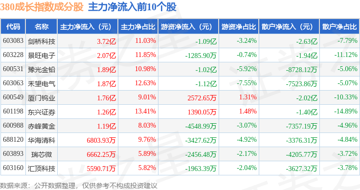 资金流向方面,380成长(000117)指数成份股当日主力资金净流入合计9.25亿元,游资资金净流出合计3.19亿元,散户资金净流出合计6.06亿元。成份股资金流向详情见下表: