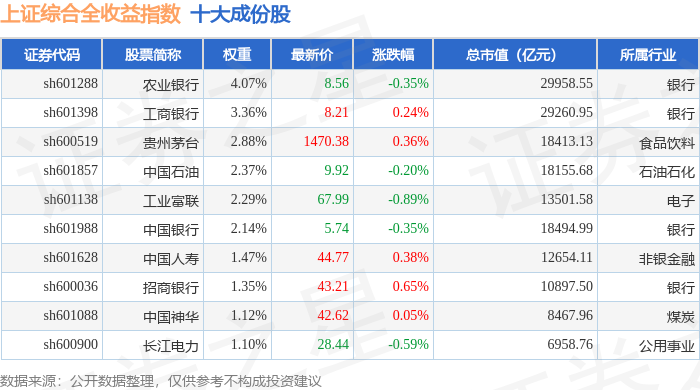 上证综合全收益(000888)指数十大成份股详情如下: