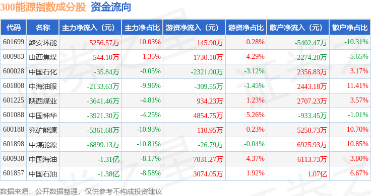 资金流向方面,300能源(000908)指数成份股当日主力资金净流出合计4.31亿元,游资资金净流入合计1.52亿元,散户资金净流入合计2.79亿元。成份股资金流向详情见下表: