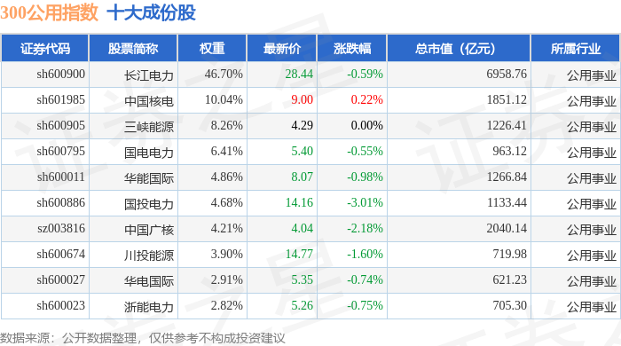 证券之星消息,11月13日,300公用(000917)指数报收于2592.9点,跌0.74%,成交82.55亿元,换手率0.44%。当日该指数成份股中,上涨的有1家,中国核电以0.22%的涨幅领涨,下跌的有11家,国投电力以3.01%的跌幅领跌。