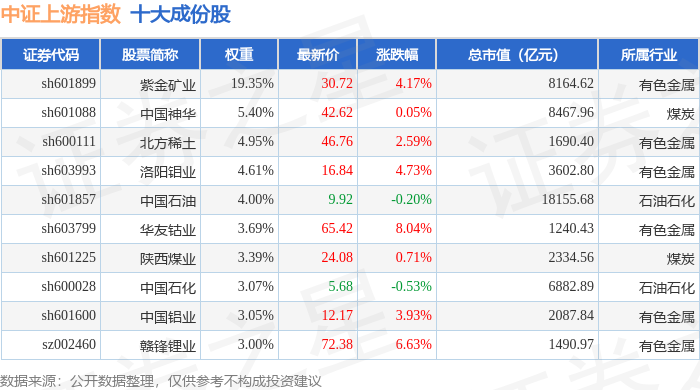 证券之星消息,11月13日,中证上游(000961)指数报收于4808.83点,涨2.97%,成交1035.51亿元,换手率1.14%。当日该指数成份股中,上涨的有40家,天齐锂业以9.98%的涨幅领涨,下跌的有10家,中国海油以2.1%的跌幅领跌。