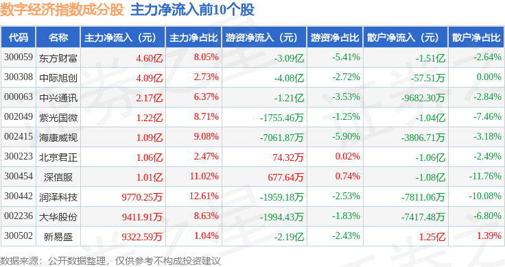 资金流向方面,数字经济(399262)指数成份股当日主力资金净流入合计13.24亿元,游资资金净流出合计9.05亿元,散户资金净流出合计4.19亿元。成份股资金流向详情见下表: