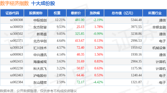证券之星消息,11月13日,数字经济(399262)指数报收于2683.2点,涨0.3%,成交975.15亿元,换手率1.76%。当日该指数成份股中,上涨的有40家,江波龙以5.23%的涨幅领涨,下跌的有10家,东山精密以4.42%的跌幅领跌。