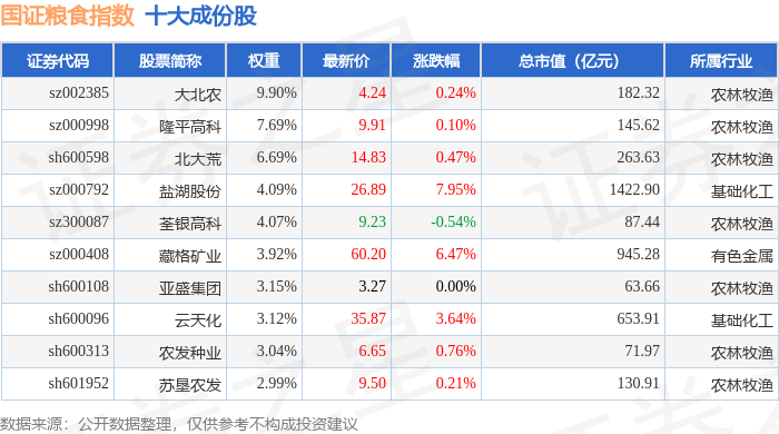 证券之星消息,11月13日,国证粮食(399365)指数报收于13626.34点,涨1.43%,成交325.17亿元,换手率3.37%。当日该指数成份股中,上涨的有38家,新安股份以10.04%的涨幅领涨,下跌的有9家,宏辉果蔬以1.61%的跌幅领跌。