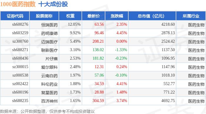 证券之星消息,11月13日,1000医药(399386)指数报收于6188.13点,涨1.26%,成交416.84亿元,换手率1.15%。当日该指数成份股中,上涨的有58家,信立泰以5.4%的涨幅领涨,下跌的有32家,大参林以2.89%的跌幅领跌。