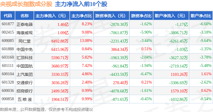 资金流向方面,央视成长(399552)指数成份股当日主力资金净流出合计12.92亿元,游资资金净流入合计7.3亿元,散户资金净流入合计5.62亿元。成份股资金流向详情见下表: