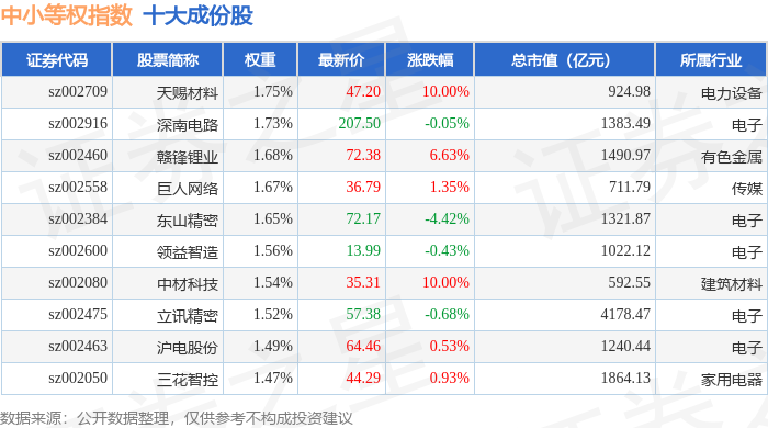 证券之星消息,11月13日,中小等权(399634)指数报收于4306.23点,涨2.01%,成交1265.91亿元,换手率1.47%。当日该指数成份股中,上涨的有79家,石基信息以10.02%的涨幅领涨,下跌的有19家,东山精密以4.42%的跌幅领跌。