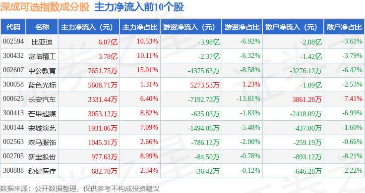 资金流向方面,深成可选(399683)指数成份股当日主力资金净流入合计1.48亿元,游资资金净流出合计5.54亿元,散户资金净流入合计4.06亿元。成份股资金流向详情见下表: