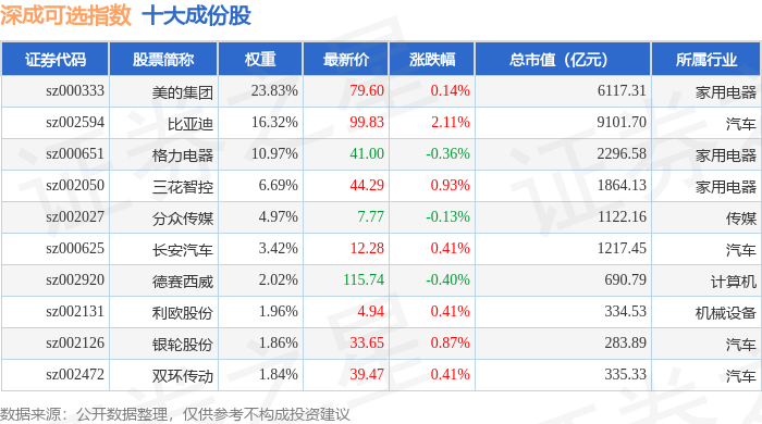 证券之星消息,11月13日,深成可选(399683)指数报收于1931.51点,涨0.64%,成交418.06亿元,换手率2.2%。当日该指数成份股中,上涨的有29家,富临精工以11.11%的涨幅领涨,下跌的有16家,万向钱潮以2.5%的跌幅领跌。