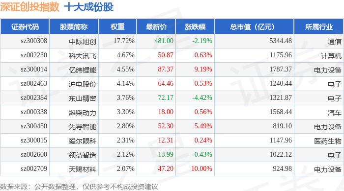 证券之星消息,11月13日,深证创投(399696)指数报收于4135.8点,涨1.2%,成交1251.85亿元,换手率4.16%。当日该指数成份股中,上涨的有131家,凯盛新材以10.92%的涨幅领涨,下跌的有35家,东山精密以4.42%的跌幅领跌。