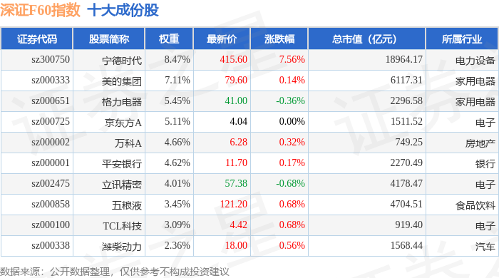 证券之星消息,11月13日,深证F60(399701)指数报收于8313.22点,涨1.26%,成交941.51亿元,换手率0.93%。当日该指数成份股中,上涨的有45家,天齐锂业以9.98%的涨幅领涨,下跌的有14家,招商公路以2.69%的跌幅领跌。