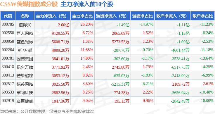 资金流向方面,CSSW传媒(399810)指数成份股当日主力资金净流出合计2.31亿元,游资资金净流出合计2386.85万元,散户资金净流入合计2.54亿元。成份股资金流向详情见下表: