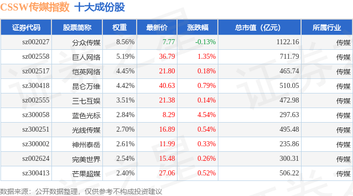 证券之星消息,11月13日,CSSW传媒(399810)指数报收于3081.7点,涨0.69%,成交336.49亿元,换手率2.6%。当日该指数成份股中,上涨的有71家,值得买以20.0%的涨幅领涨,下跌的有22家,浙文互联以1.48%的跌幅领跌。
