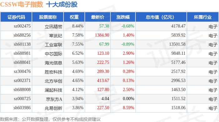 证券之星消息,11月13日,CSSW电子(399811)指数报收于5605.53点,涨0.98%,成交1114.33亿元,换手率1.57%。当日该指数成份股中,上涨的有44家,兆易创新以8.59%的涨幅领涨,下跌的有14家,东山精密以4.42%的跌幅领跌。