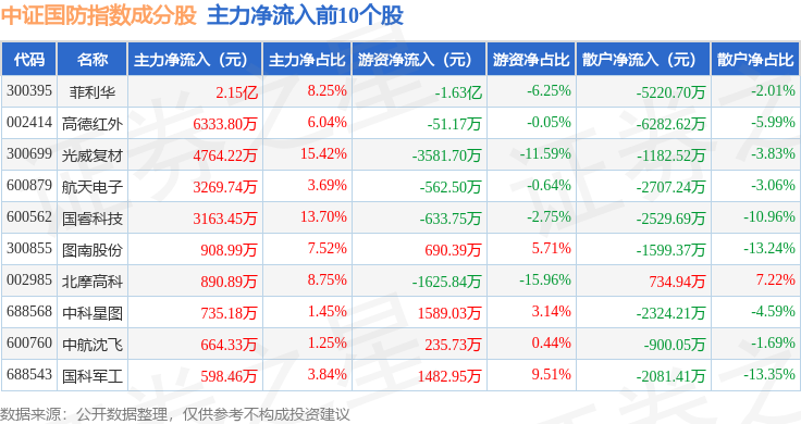 资金流向方面,中证国防(399973)指数成份股当日主力资金净流出合计2.25亿元,游资资金净流入合计6572.41万元,散户资金净流入合计1.59亿元。成份股资金流向详情见下表: