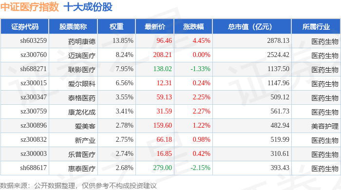 中证医疗(399989)指数十大成份股详情如下: