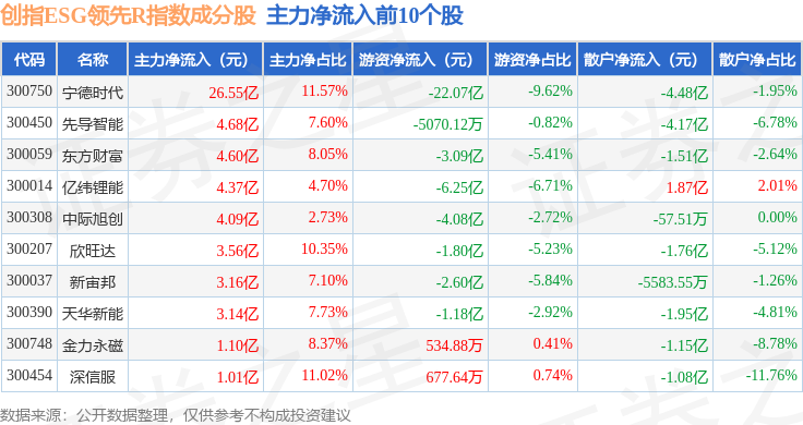 资金流向方面,创指ESG领先R(470031)指数成份股当日主力资金净流入合计53.51亿元,游资资金净流出合计40.65亿元,散户资金净流出合计12.86亿元。成份股资金流向详情见下表: