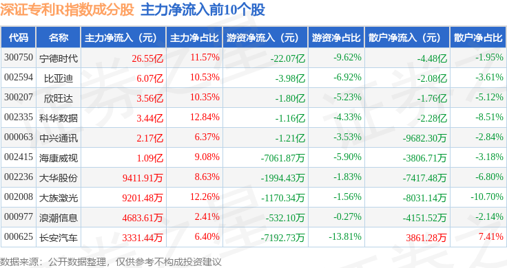 资金流向方面,深证专利R(470067)指数成份股当日主力资金净流入合计33.57亿元,游资资金净流出合计27.66亿元,散户资金净流出合计5.91亿元。成份股资金流向详情见下表: