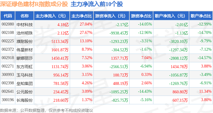 资金流向方面,深证绿色建材R(470077)指数成份股当日主力资金净流入合计4.97亿元,游资资金净流出合计3.52亿元,散户资金净流出合计1.45亿元。成份股资金流向详情见下表: