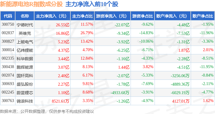 资金流向方面,新能源电池R(480027)指数成份股当日主力资金净流入合计67.8亿元,游资资金净流出合计45.67亿元,散户资金净流出合计22.13亿元。成份股资金流向详情见下表: