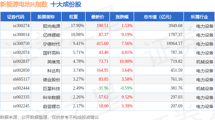 新能源电池R(480027)指数十大成份股详情如下: