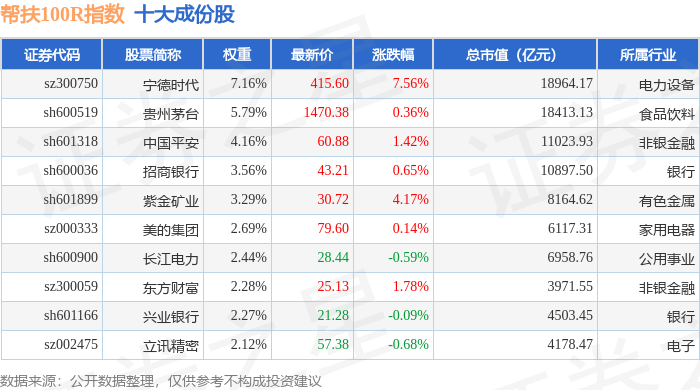 帮扶100R(480065)指数十大成份股详情如下: