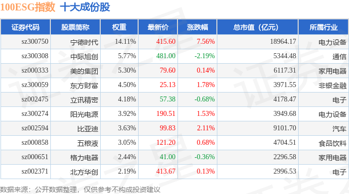 资金流向方面,100ESG(970027)指数成份股当日主力资金净流入合计57.17亿元,游资资金净流出合计42.02亿元,散户资金净流出合计15.15亿元。成份股资金流向详情见下表: