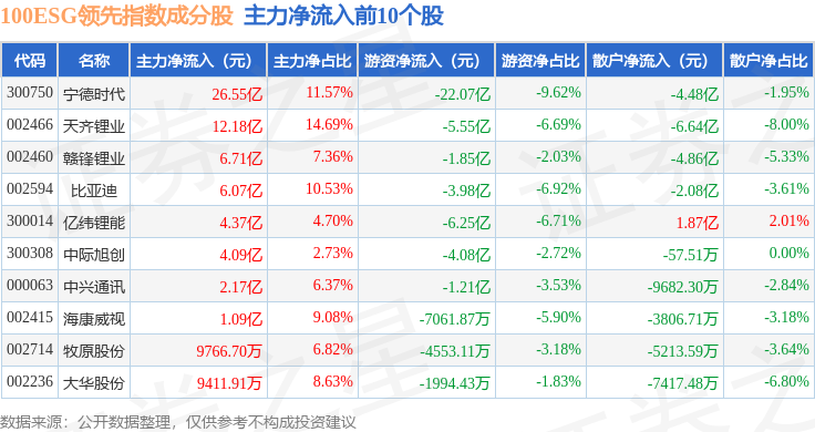 资金流向方面,100ESG领先(970030)指数成份股当日主力资金净流入合计55.95亿元,游资资金净流出合计41.61亿元,散户资金净流出合计14.35亿元。成份股资金流向详情见下表: