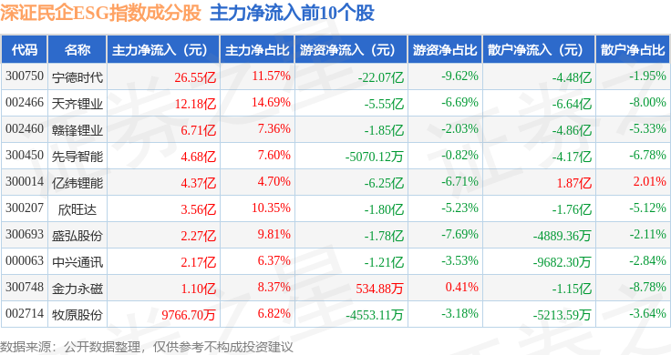 资金流向方面,深证民企ESG(970056)指数成份股当日主力资金净流入合计59.8亿元,游资资金净流出合计40.02亿元,散户资金净流出合计19.79亿元。成份股资金流向详情见下表: