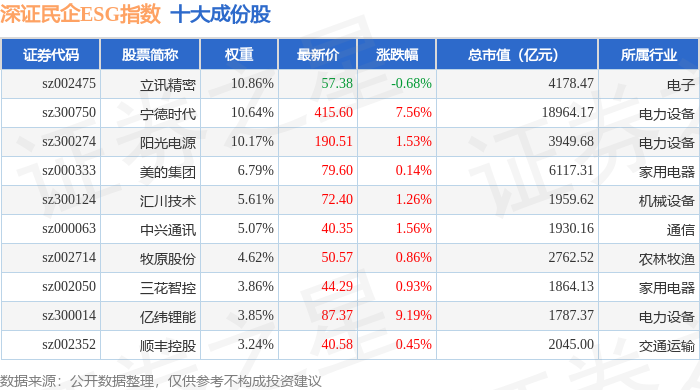 深证民企ESG(970056)指数十大成份股详情如下: