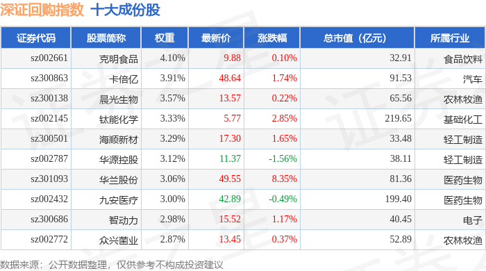 深证回购(970063)指数十大成份股详情如下: