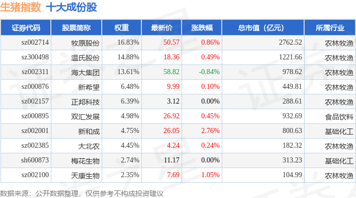 资金流向方面,生猪指数(980073)成份股当日主力资金净流入合计1.06亿元,游资资金净流出合计8271.71万元,散户资金净流出合计2331.18万元。成份股资金流向详情见下表: