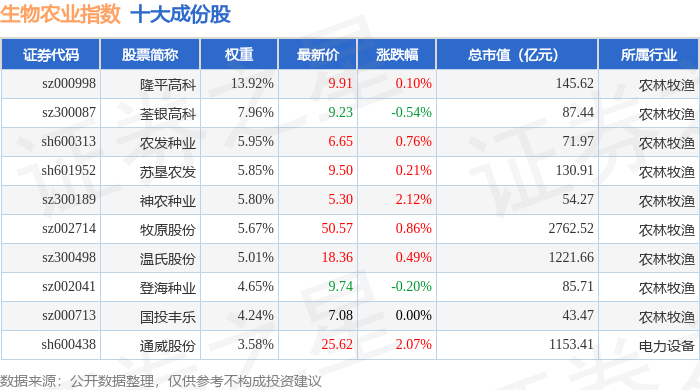 资金流向方面,生物农业(980072)指数成份股当日主力资金净流入合计6.8亿元,游资资金净流出合计5008.42万元,散户资金净流出合计6.3亿元。成份股资金流向详情见下表: