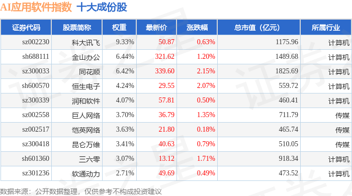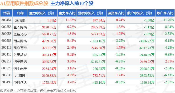 资金流向方面,AI应用软件(980107)指数成份股当日主力资金净流出合计1.6亿元,游资资金净流入合计1.78亿元,散户资金净流出合计1715.33万元。成份股资金流向详情见下表: