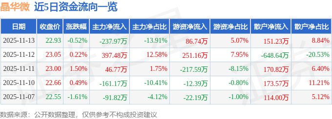 11月13日的资金流向数据方面,主力资金净流出237.97万元,占总成交额13.91%,游资资金净流入86.74万元,占总成交额5.07%,散户资金净流入151.23万元,占总成交额8.84%。