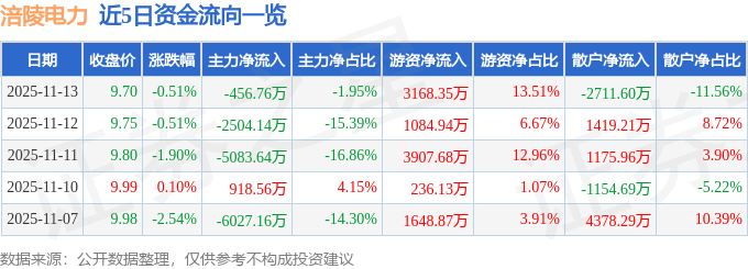 证券之星消息,截至2025年11月13日收盘,涪陵电力(600452)报收于9.7元,下跌0.51%,换手率1.58%,成交量24.22万手,成交额2.35亿元。