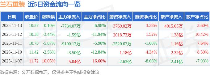 11月13日的资金流向数据方面,主力资金净流出7784.07万元,占总成交额6.98%,游资资金净流入3769.02万元,占总成交额3.38%,散户资金净流入4015.05万元,占总成交额3.6%。