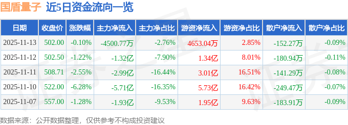 证券之星消息,截至2025年11月13日收盘,国盾量子(688027)报收于502.0元,下跌0.1%,换手率4.04%,成交量3.25万手,成交额16.3亿元。